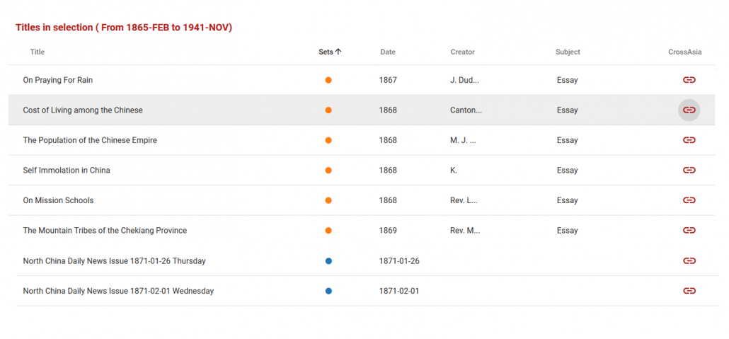 Der ITR Explorer bietet die Möglichkeit nach Wörtern oder Phrasen (mit und ohne CJK Mapping) im gesamten Fundus des ITR zu suchen, oder diese auf einen Korpus von bestimmten Quellen zu fokussieren. Jede Abfrage generiert ein Ergebnisset, das dann mit weiteren Ergebnissets mittels der Operatoren UND oder NICHT kombiniert werden kann und dann als neues Ergebnisset zur Verfügung steht. Abfragen, die auf der Basis unterschiedlicher Quellen erstellt werden, können mit ODER zusammengeführt werden. In einem nächsten Schritt können die Ergebnissets für eine Visualisierung als Schnittmengen-Diagramm (Abb. 2a) oder als Verlauf über die Zeit (Abb. 2b) ausgewählt werden. Durch Markieren eines Bereichs des Diagramms oder des Zeitstrahls in der Visualisierung, werden die jeweils relevanten Titel aufgelistet (Abb. 3) und können über einen Link direkt aufgerufen werden.