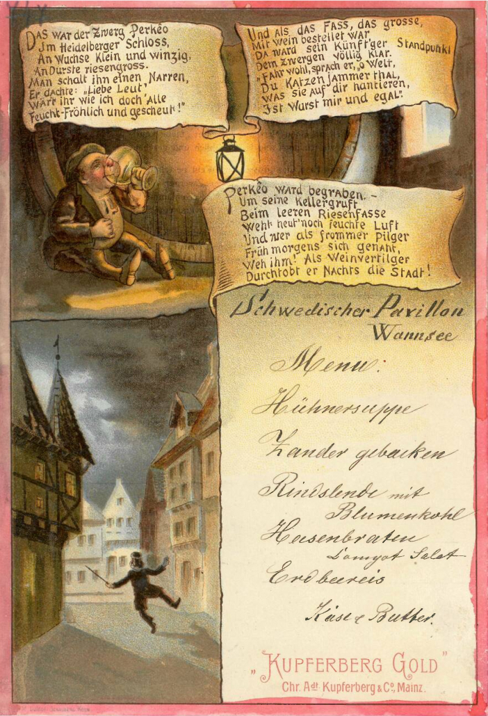 The cards originate from diverse contexts: royal and imperial courts (including Kaiser Wilhelm II’s court), private celebrations (weddings, club dinners), major public events (e.g., the opening of the Nord-Ostsee-Kanal and Cologne Cathedral), luxury hotels (e.g., Frankfurter Hof, Hotel Schweizerhof), and transatlantic cruise ships. Many feature intricate designs and rich illustrations.