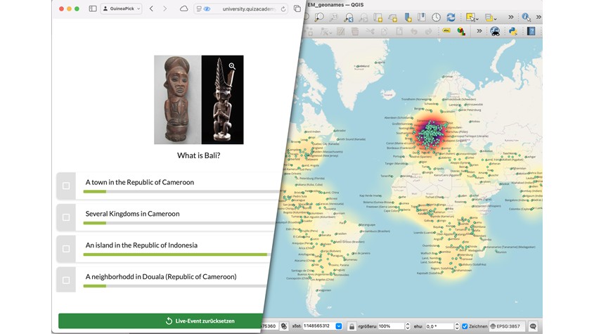 Using our expertise, we combined place names referring to the same location into a single entry within the available timeframe. To obtain corresponding geographical information in a computer-readable format, we used the GeoNames API and visualized all the data points we could find as a heatmap using QGIS.